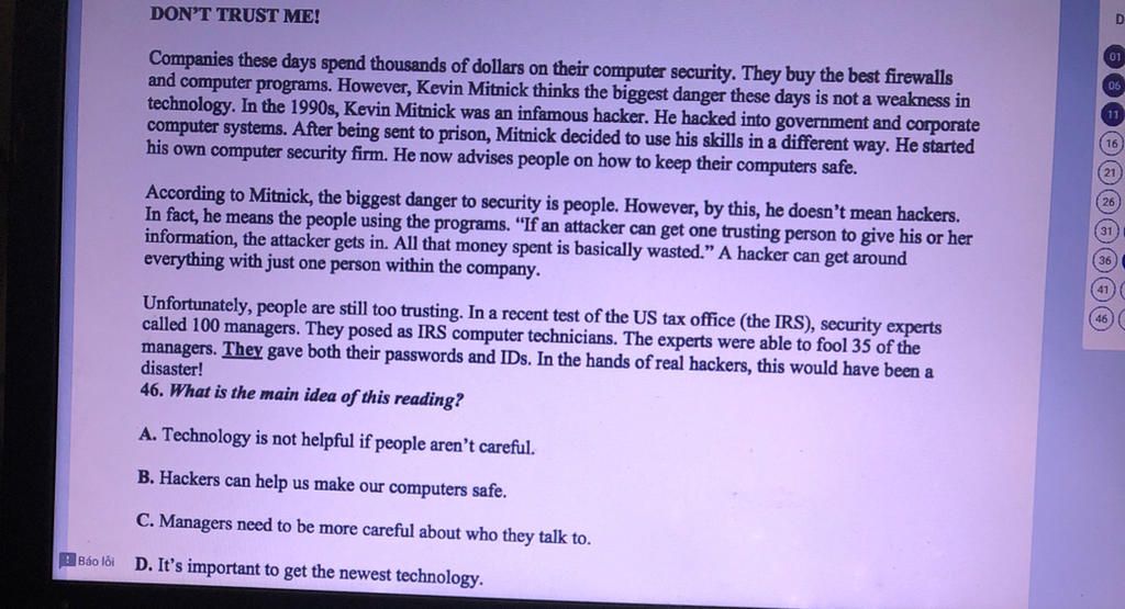 ->Dựa vào đoạn $2$: Acording to Mitnick, the biggest danger to security is people...