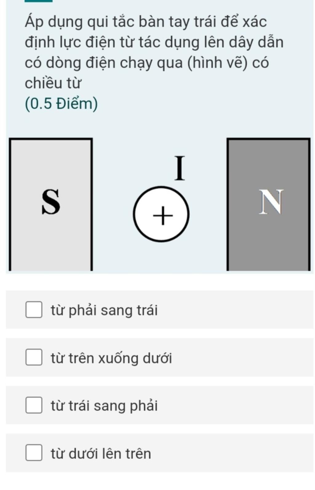 + Lực điện từ có phương vuông góc với đường sức từ (trong hình đường sức từ đi ra từ cực $Bắc$ và đi vào ở cực $Nam$), chiều của lực điện từ đi từ dưới lên trên.