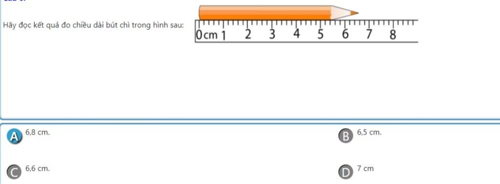 `to` Chiều dài bút chì là : `6+(2.3)=6` cm + `6` mm `=6,6cm`