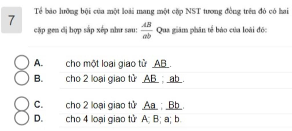 Câu 7: $\frac{AB}{ab}$ giảm phâm sẽ cho ra B. Cho 2 loại giao tử AB : ab