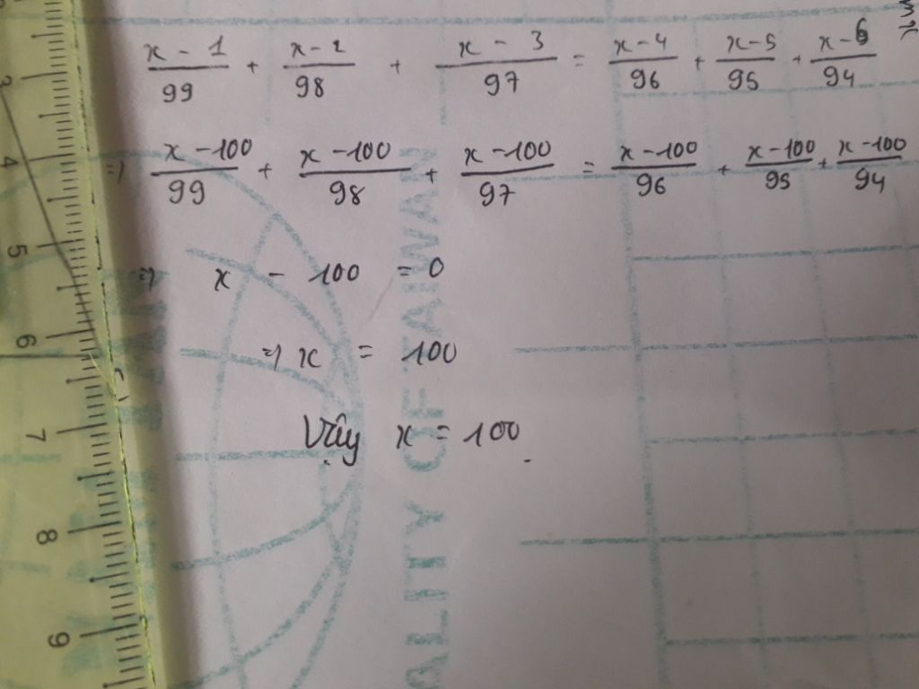 $x-\frac{1}{99}+x-\frac{2}{98}+x-\frac{3}{97}=x-\frac{4}{96}+x-\frac{5}{95}+x-\frac{6}{94}\\\Leftrightarrow -0,1051230345=0$