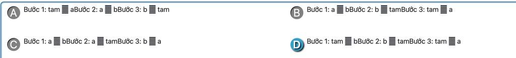 => Đáp án : A. Bước 1 : tam ← a; Bước 2 : a ← b; Bước 3 : b ← tam
