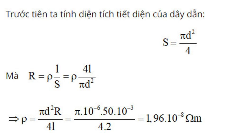 `ρ = (R . S)/l = (0,05 . 7,854 . 10^(-7))/2 ~~ 1,96 . 10^(-8)` `( Ωm )`