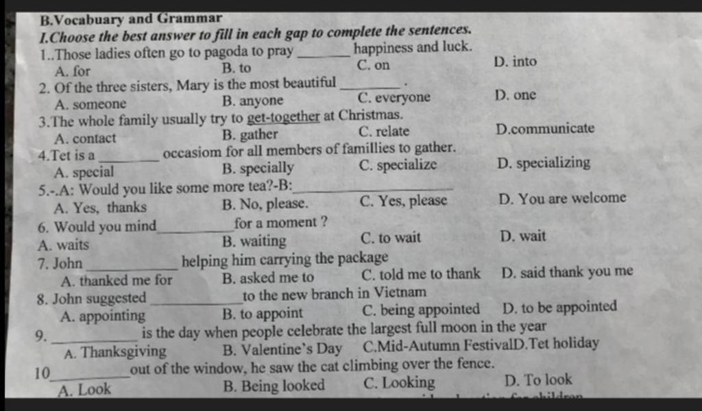 9. C - Thấy có largest full moon: trăng tròn và to nhất, liên quan đến tết Trung Thu.