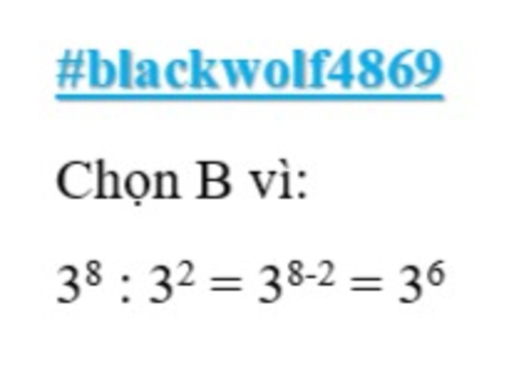 `3^8 : 3^2 = 3^(8 - 2) = 3^6`