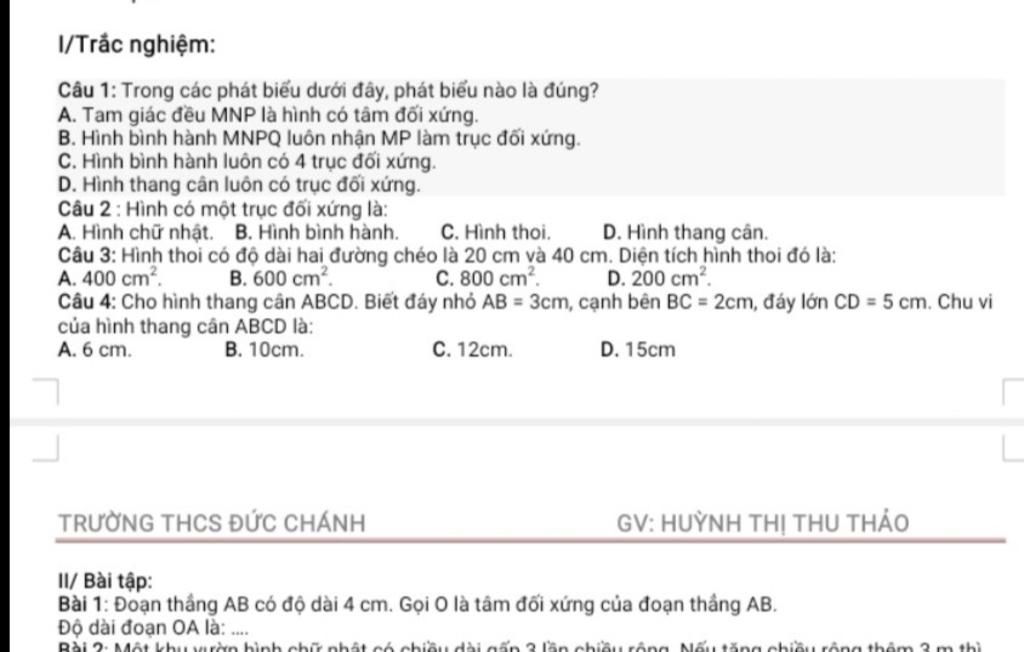 Câu 2: Hình thang cân có 1 trục đối xứng.
