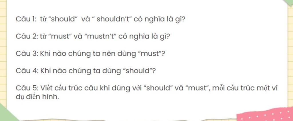 Câu 4: Chúng ta sử dụng "should" khi nói về một sự việc hay hiện tượng gì đó không hợp lý hay không diễn ra theo ý muốn của chúng ta và đưa ra lời khuyên hợp lý.