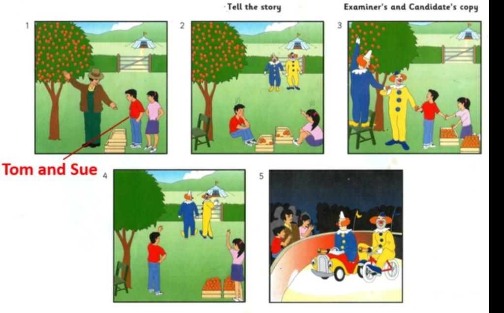 Picture `1` : Tom and Sue go to the garden and pick oranges
