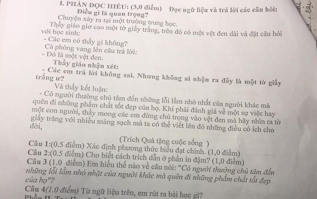 Thấy giáo gio cao một tờ giấy trắng, trên đó có một vệt đen dài và đặt câu hỏi