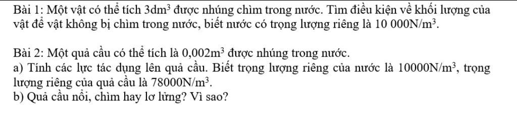 Vậy đk để..................không bị chìm trong nước là khối lượng của vật phải nhỏ hơn 3kg