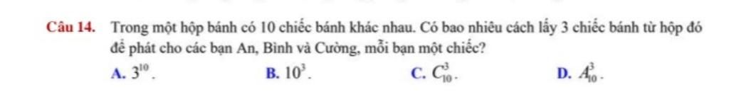 chọn ra 3 cái bánh trong 10 chiếc khác nhau có số cách là $C³_{10}$