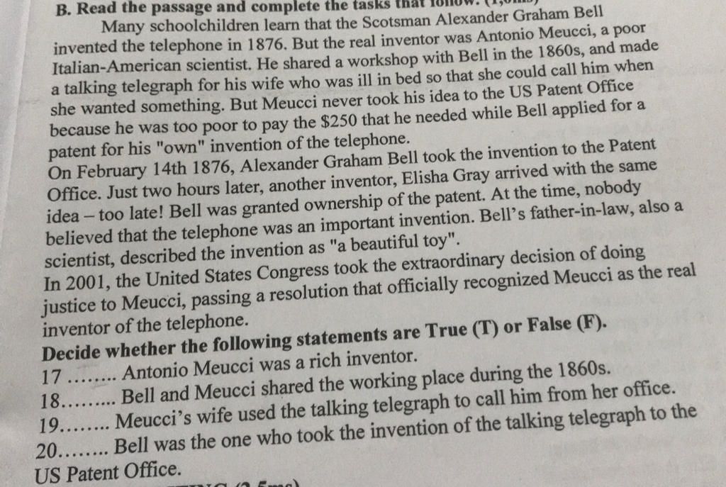 invented the telephone in 1876. But the real inventor was Antonio Meucci, a poor