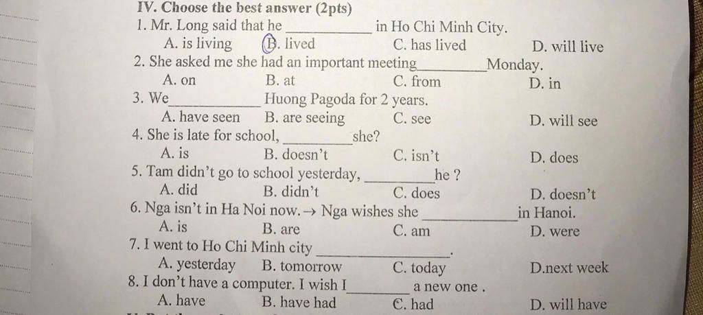 IV. Choose the best answer (2pts)