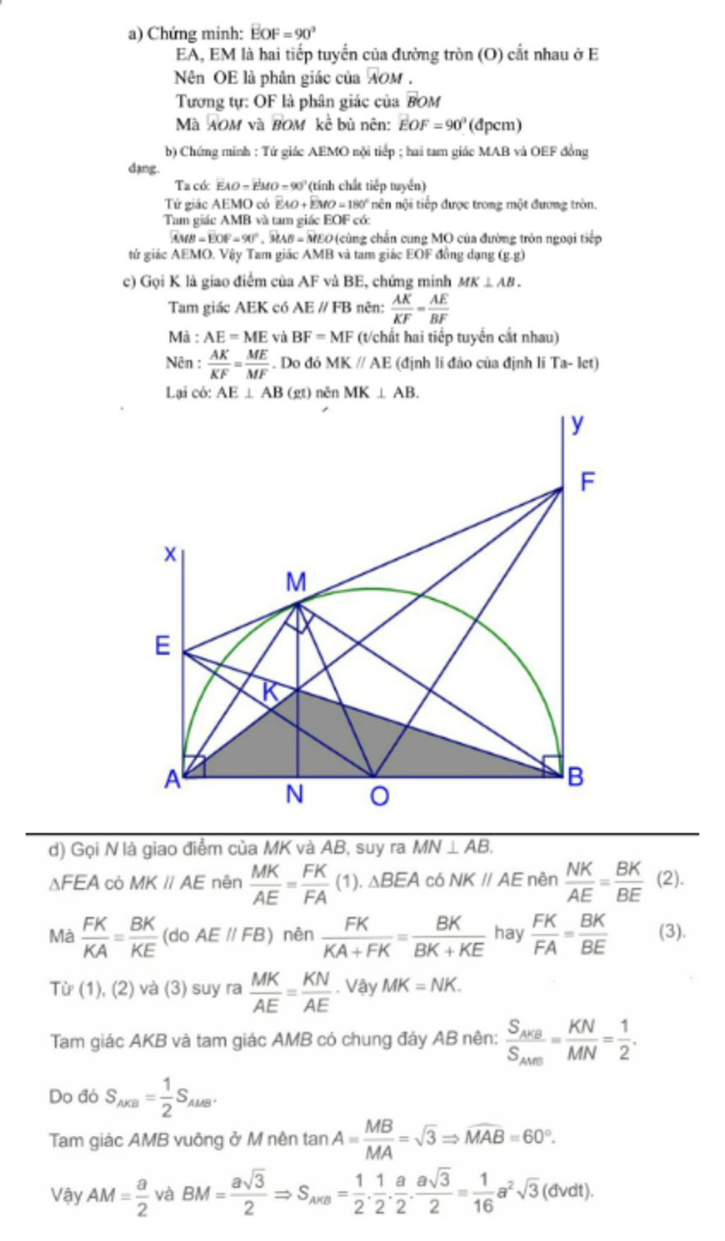 i Cho nửa đường tròn (O) đường kính AB = a. Gọi Ax, By là các tia vuông góc với AB ( Ax, By thuộc cùng một nửa mặt phẳng bờ AB). Qua điểm M thuộc nửa đường tròn (O) (M khác A và B) kẻ tiếp tuyến với nửa đường tròn (O); nó cắt Ax, By lần lượt ở E và F.