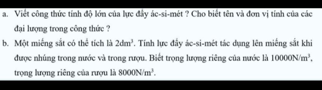 b. Một miếng sắt có thể tích là 2dm³. Tính lực đẩy ác-si-mét tác dụng lên miếng sắt khi