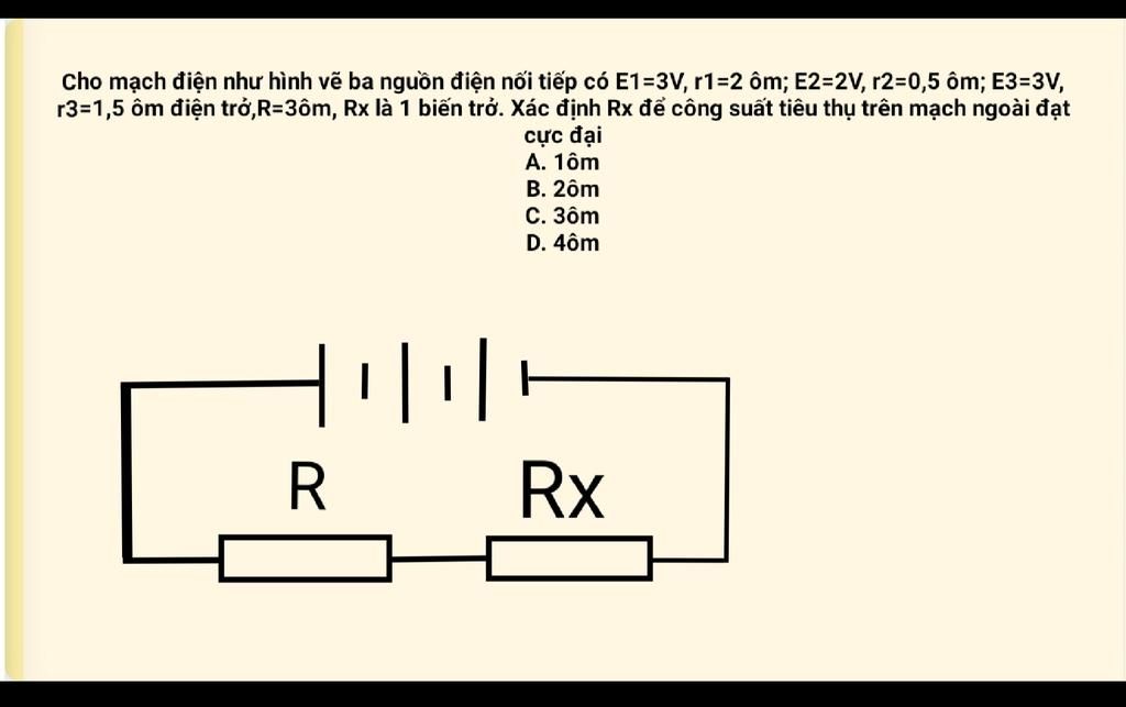 r3=1,5 ôm điện trở,R=3ôm, Rx là 1 biến trở. Xác định Rx để công suất tiêu thụ trên mạch ngoài đạt