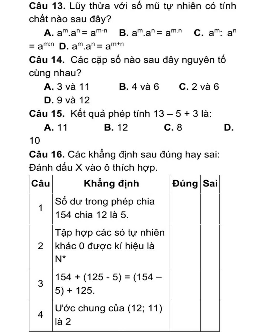Câu 13: D ( dựa vào tính chất $x^{m}$ . $x^{ n}$ = $x^{n+m}$ )