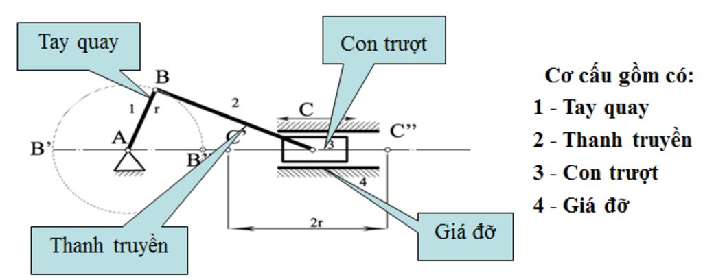 Khi tay quay 1 quay quanh trục A, đầu B của thanh truyền 2 chuyển động tròn làm con trượt 3 chuyển động tịnh tiến qua lại trên giá đỡ 4 . Nhờ đó chuyển động quay của tay quay biến thành chuyển động tịnh tiến qua lại của con trượt.