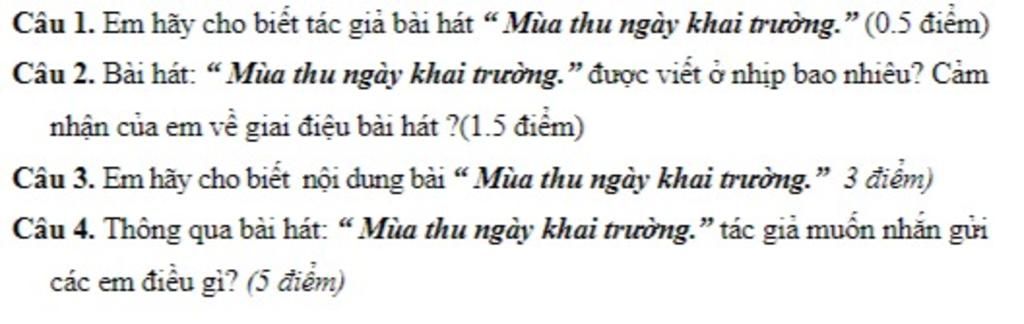 Câu 2:Bài hát Mùa thu ngày khai trường được viết ở số chỉ nhịp: 2/4. Có rất nhiều bài hát viết về mùa thu với rất sắc thái tình cảm khác nhau nhưng bài Mùa thu ngày khai trường ta nghe như tiếng trống trường rộn rã, nhộn nhịp, thôi thúc các em đến trường trong niềm vui sướng phấn khởi làm tan đi cái oi ả của mùa hè để bước sang mùa thu dịu mát, mùa thu của ngày tựu trường.