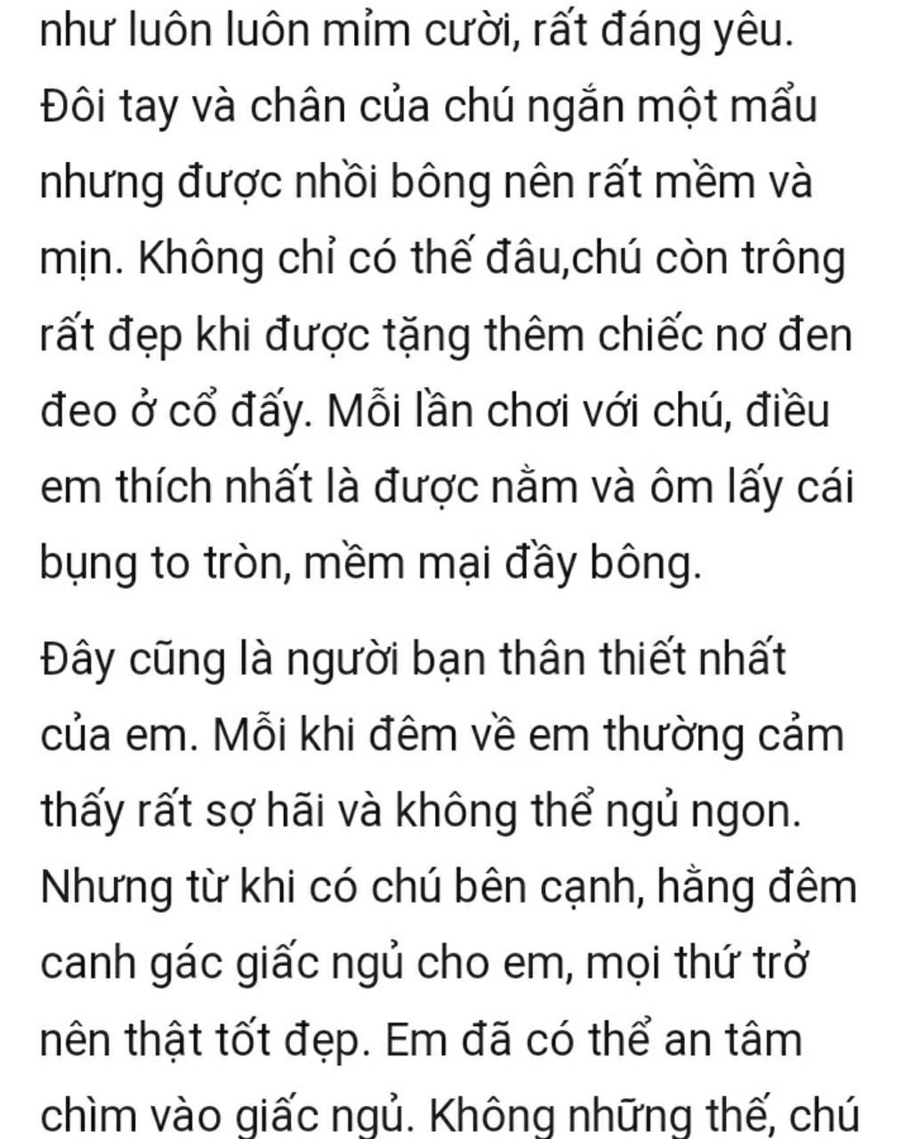Con gấu bông doraemon được mẹ em mua tặng cho em nhân ngày sinh nhật, hình ảnh đó đã gắn bó với tâm trí của em và mang trong em những cung bậc riêng và nó tạo nên những ý nghĩa riêng và càng có ý nghĩa, khi hình ảnh đó gắn bó với mỗi người chúng ta hình ảnh đó đã tác động đến cuộc đời của em, con gấu bông màu vàng, nó được làm bằng lông dày và rất mượt, nó gắn bó mạnh mẽ với tâm trí của em bởi hình ảnh của nó mang những cung bậc riêng và vô cùng có ý nghĩa lớn, mũi của nó màu đỏ được đính bằng nhựa, trên cổ của nó có đeo một chiếc nơ nó có hai tay và hai chân, đầu của nó to và tròn trên đầu có hai cái tai và mũ, hình ảnh đó đã gắn bó mạnh mẽ với con người, hình ảnh trên mang lại những cung bậc riêng và đầy cảm xúc, trên khuôn hình của nó đầy đặn, trên khuôn mặt của nó có đôi mắt tròn được làm bằng nhựa thủy tinh rất long lanh, chỗ bụng của nó được làm bằng một loại vải mềm có tác dụng lớn đến những bộ phận khác, bông của nó đẹp và hấp dẫn.
