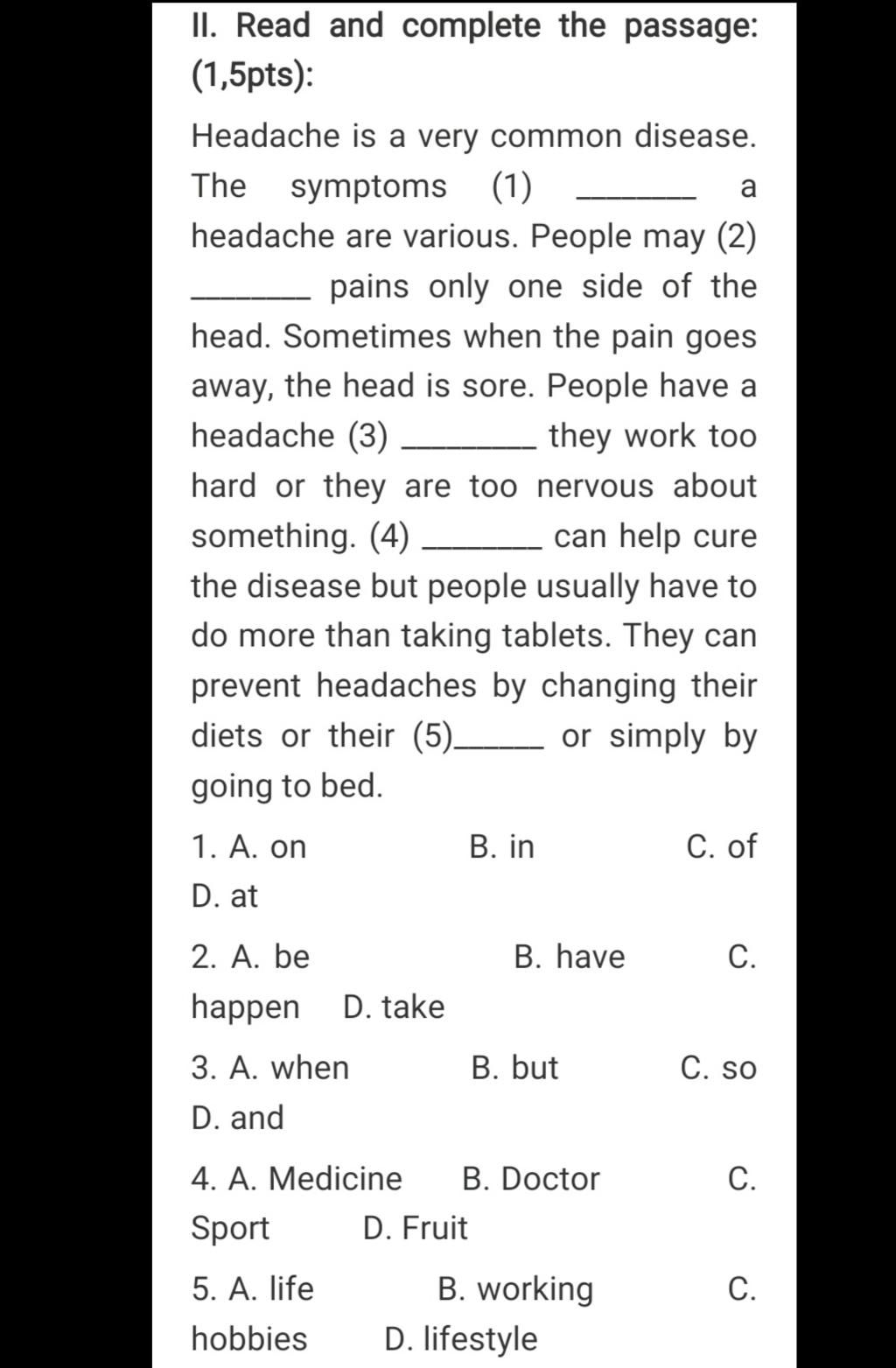 Headache is a very common disease. The symptoms (1) headache are various. People may (2)_____pains only one side of the head. Sometimes when the pain goes away, the head is sore. People have a headache (3) — they work too hard or they are too nervous about something. (4) ___ can help cure the disease but people usually have to do more than taking tablets. They can prevent headaches by changing their diets or their (5)___ or simply by going to bed.