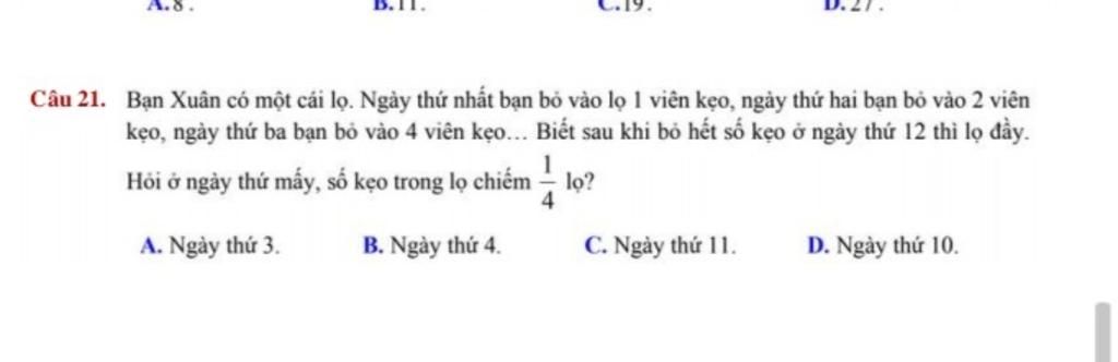 $\text{Vậy ngày thứ 10 thì số kẹo trong lọ chiếm 1/4 lọ}$