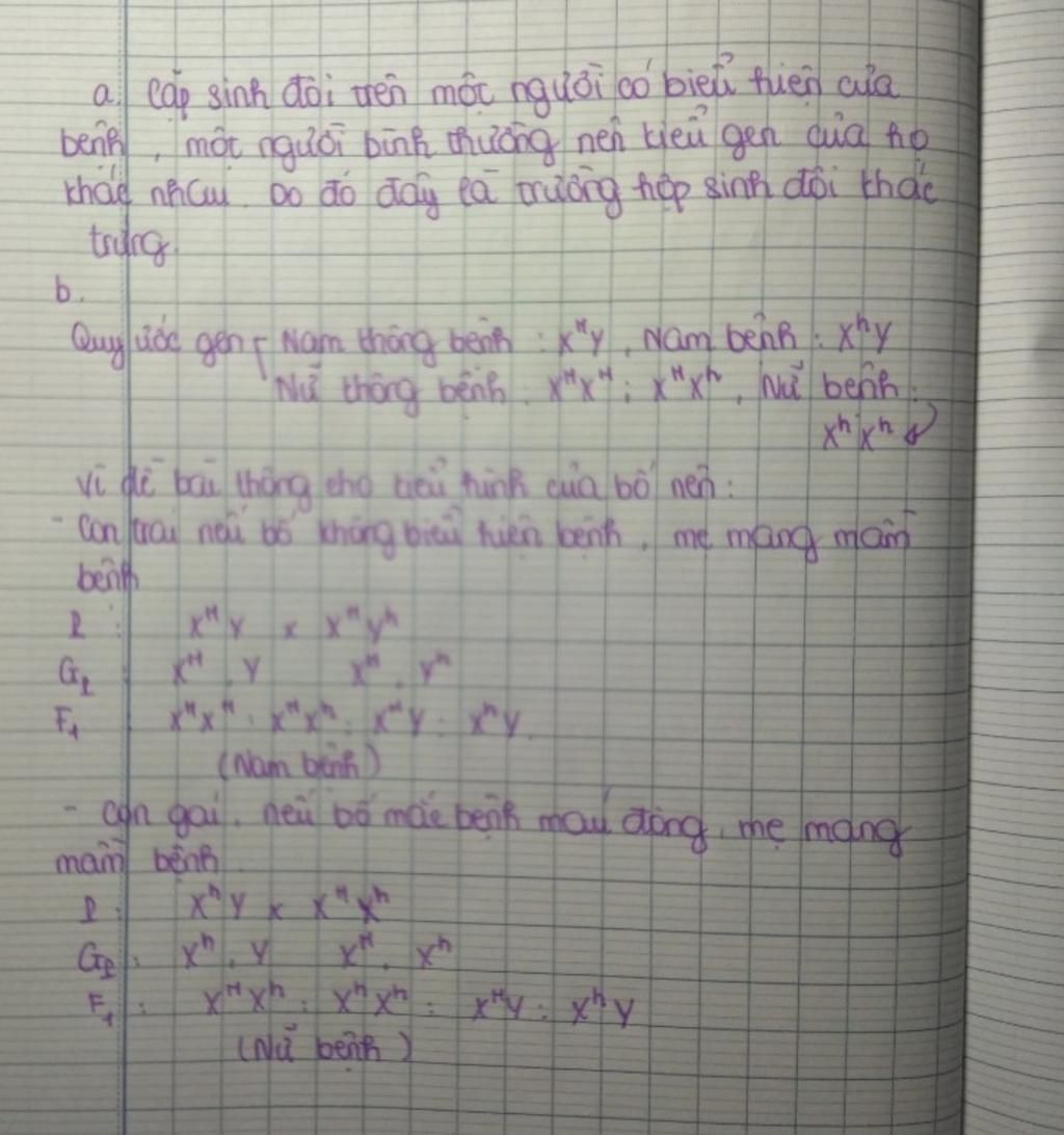 b) Người mắc bệnh này làm gái hay trai ?Giải thích. Viết kiểu gen của cặp sinh đôi trên và của người mẹ về bệnh máu khó đông.