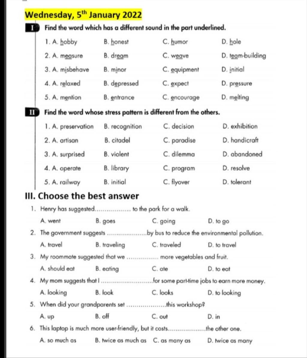 1, chọn `B` - vì đây là âm câm, còn lại đều phát thành tiếng