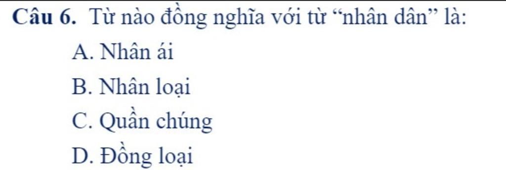 Câu 6: Từ đồng nghĩa với từ "nhân dân" là: