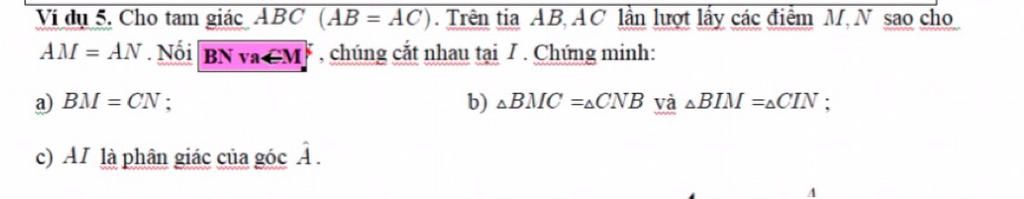 Vi dụ 5. Cho tam giác ABC (AB = AC). Trên tia AB, AC lần lượt lấy các điểm M, N sao cho