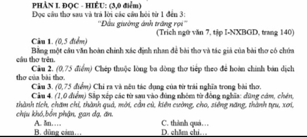 C1."Đầu giường ánh trăng rọi " là câu thơ đầu tiên của bài thơ Tĩnh dạ tứ (Cảm nghĩ trong đêm thanh tĩnh ) của nhà thơ Lí Bạch .