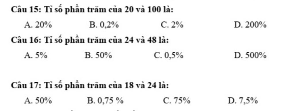 Câu 16: Tỉ số phần trăm là: `(24 : 48)` x `100 = 50 %`