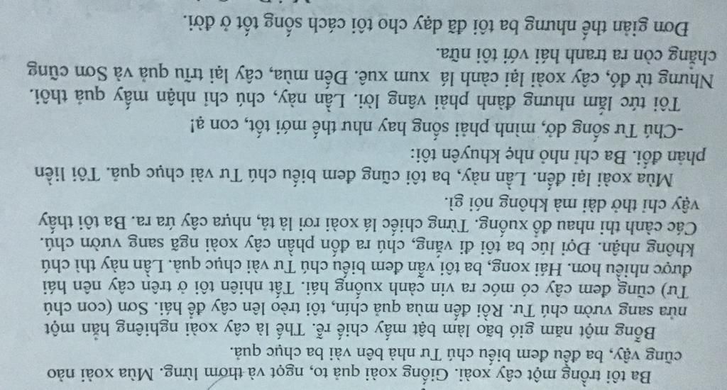 ⇒ Bài văn trên cảm nhận sự yêu thương gét bỏ cãi vả. Dù nhìn thấy hàng xóm mình chặt mất đi cây xoài của mình nhưng không đụng đậy, nói gì cả. Sự yêu quý hòa đồng từ bài văn còn nói lên tính cách của tác giả là một người tốt bụng.