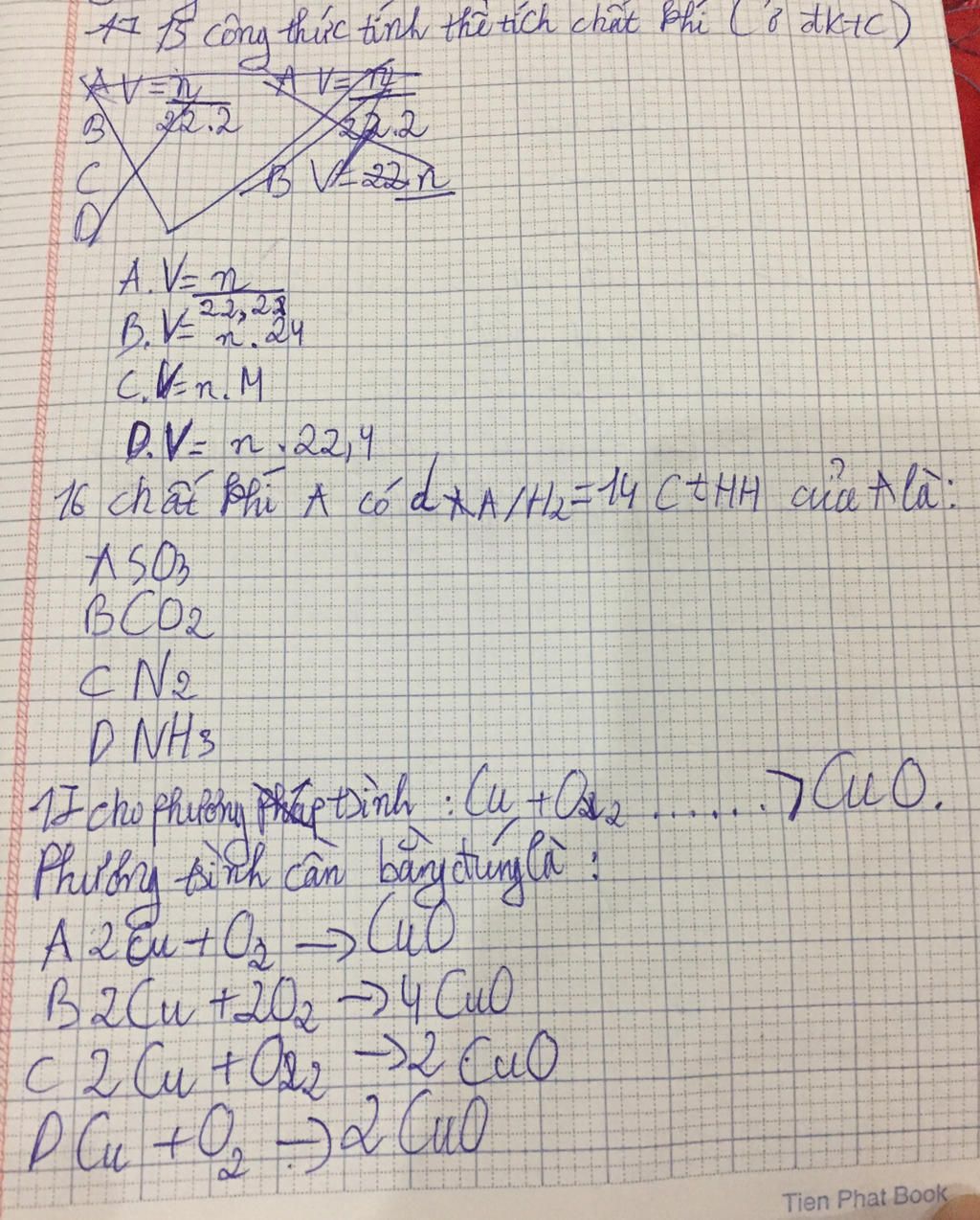 15. Đáp án là $\text{V = n. 22,4 (chỉ dành khi tính chất khí ở đktc)}$