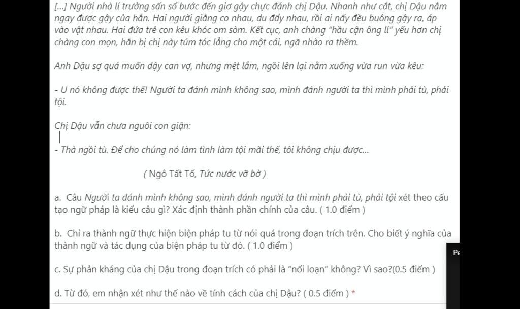 [...] Người nhà lí trưởng sấn sổ bước đến giơ gậy chực đánh chị Dậu. Nhanh như cắt, chị Dậu nắm