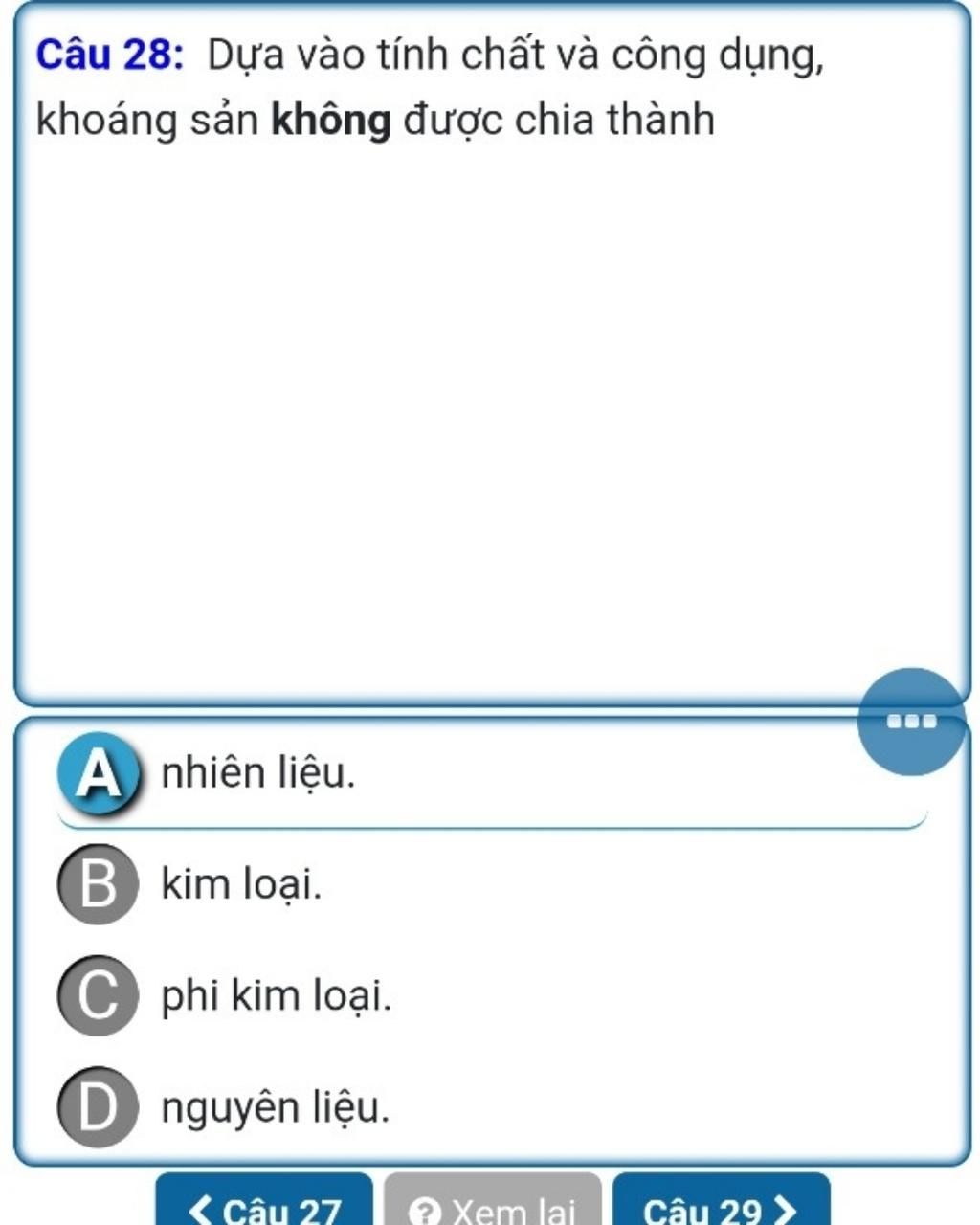 Câu 28:Dựa vào tính chất và công dụng,khoáng sản không được chia thành: