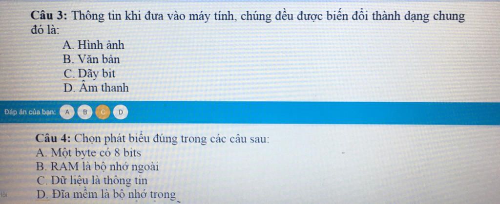 Câu 3: Thông tin khi đưa vào máy tính, chúng đều được biến đổi thành dạng chung đó là: