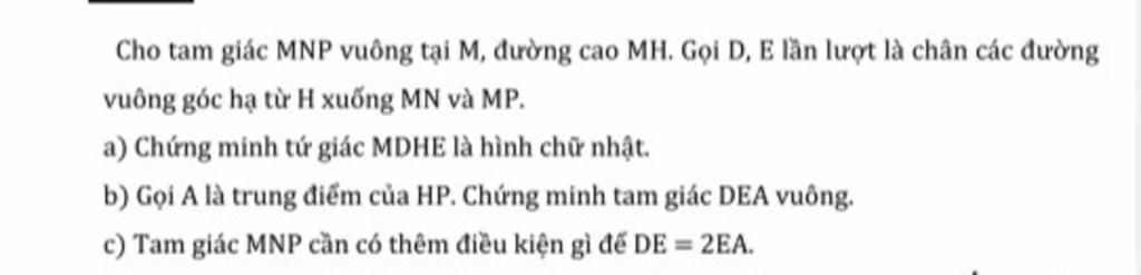 Cho tam giác MNP vuông tại M, đường cao MH. Gọi D, E lần lượt là chân các đường