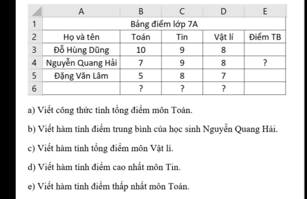 b) Điểm trung bình của Nguyễn Quang Hải?