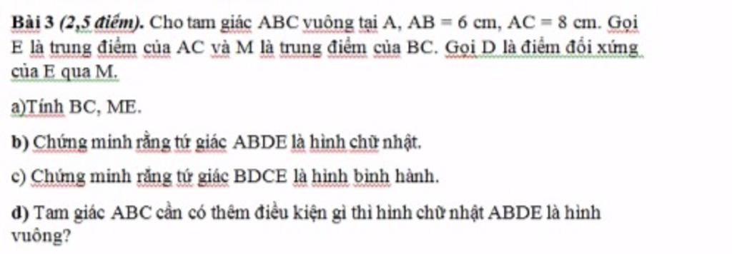 Bài 3 (2,5 điểm). Cho tam giác ABC vuông tại A, AB = 6 cm, AC = 8 cm. Gọi