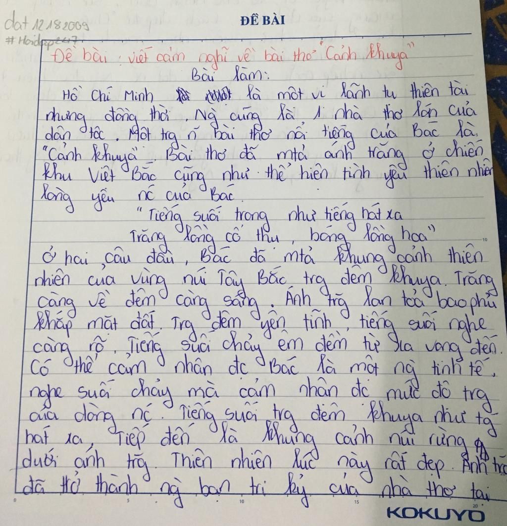 Trong tất cả những bài thơ của Bác Hồ giai đoạn kháng chiến thì em thích nhất là bài “Cảnh khuya”. Mặc dù bài thơ chỉ vỏn vẹn 4 câu thơ, nhưng đã vẽ nên một bức tranh thiên nhiên tuyệt đẹp ở núi rừng Việt Bắc, có rừng cây, có trăng sáng, có tiếng suối, và đặc biệt có một người đang ở đó thao thức không ngủ được vì lo lắng cho sự an nguy của nước nhà.