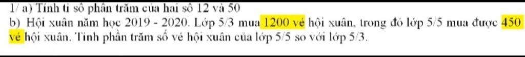 b)Phần trăm số vé hội xuân của lớp 5/5 với lớp 5/3 là