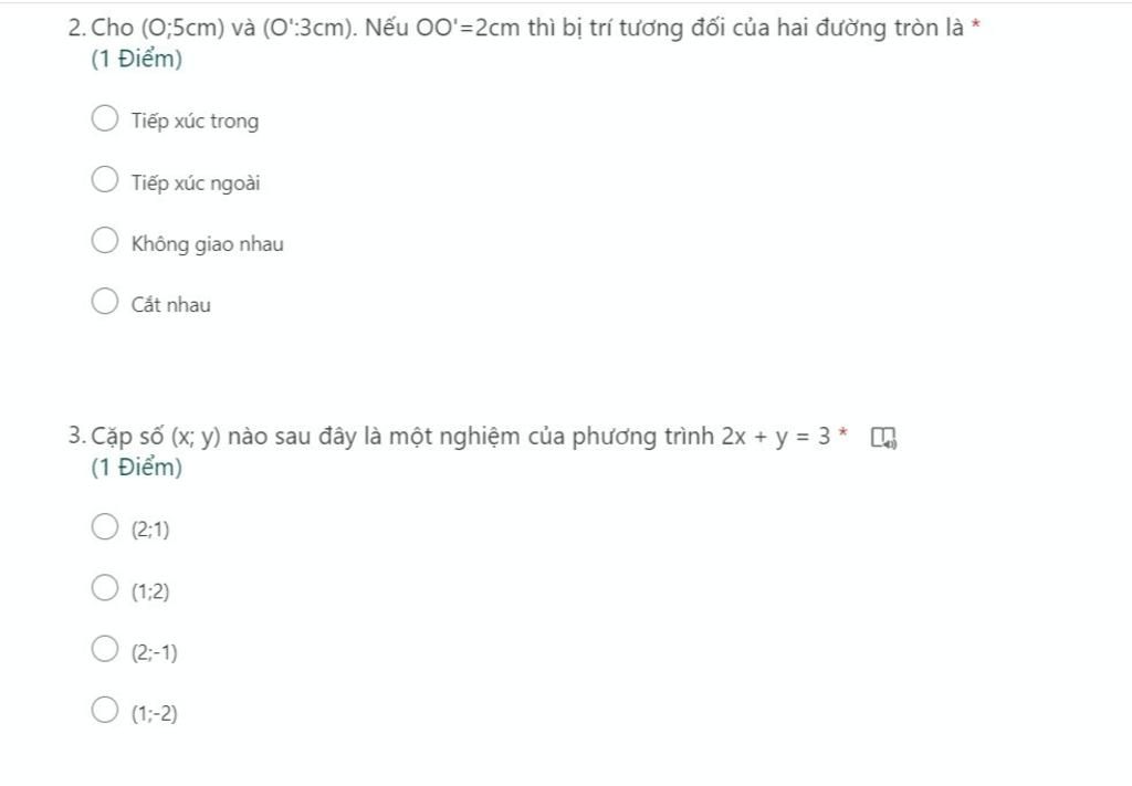 2. Cho (O;5cm) và (O':3cm). Nếu 00'=2cm thì bị trí tương đối của hai đường tròn là *