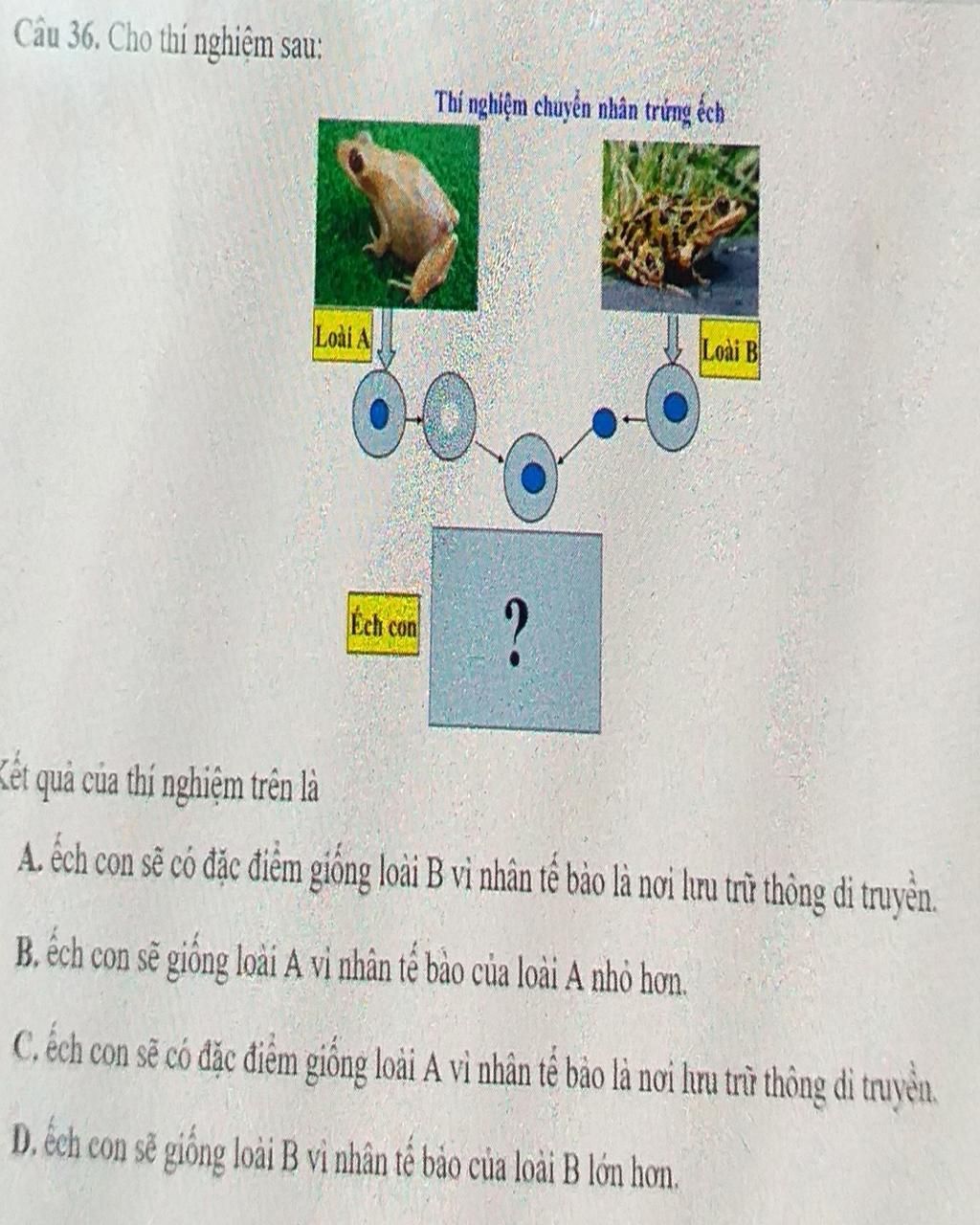 Ếch con sẽ có đặc điểm của loài B vì nhân tế bào là nơi lưu giữ vật chất di truyền, mà tế bào của ếch con mang nhân của loài B