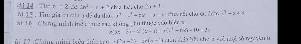 ài 14: TìmneZ để 2n² -n+2 chia hết cho 2n + 1.