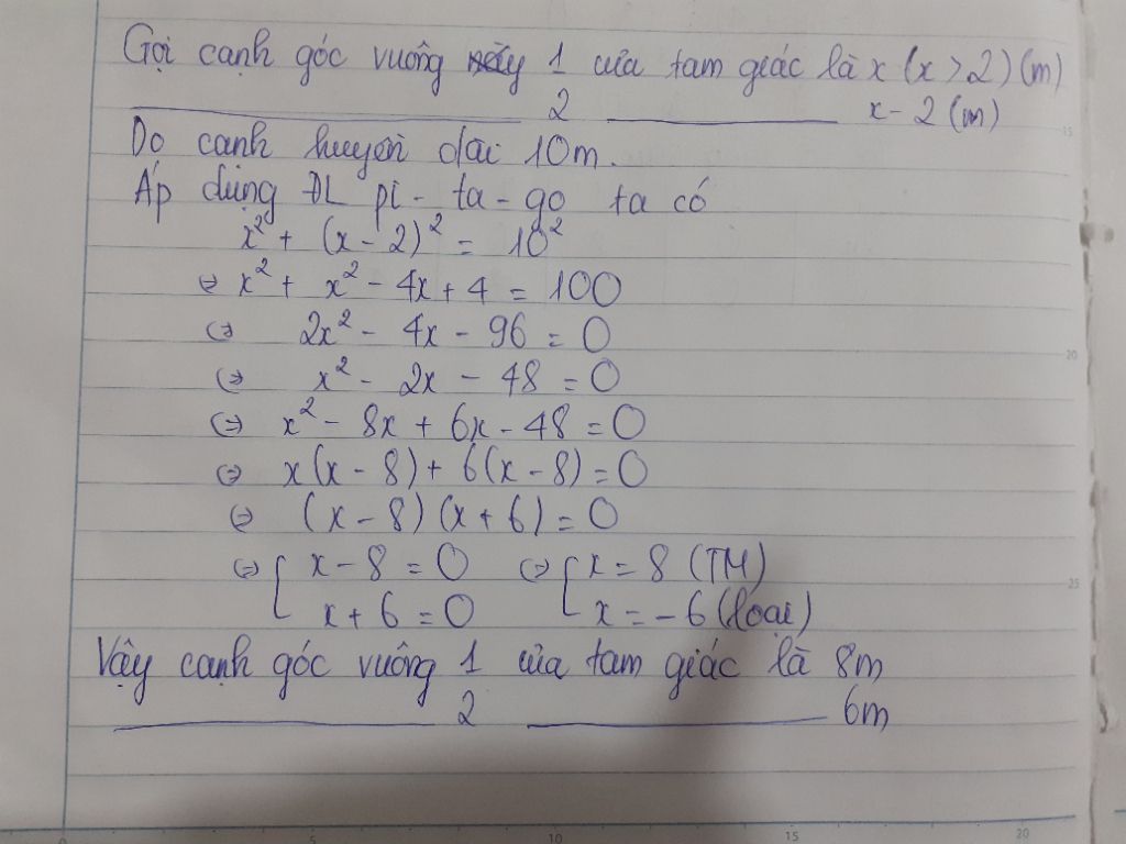 Vậy độ dài các cạnh góc vuông của tam giác vuông đó là 8m, 6m