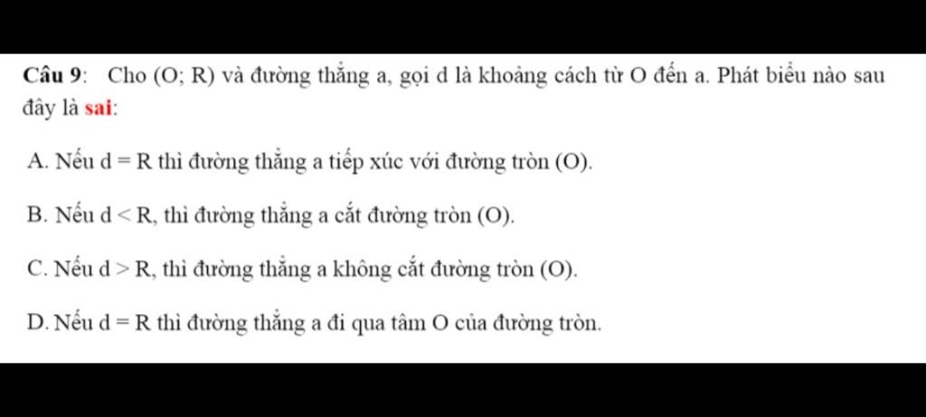 Câu 9: Cho (O; R) và đường thẳng a, gọi d là khoảng cách từ O đến a. Phát biểu nào sau