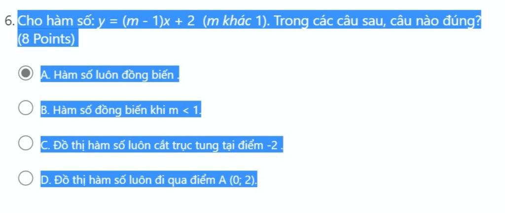 6. Cho hàm số: y = (m - 1)x + 2 (m khác 1). Trong các câu sau, câu nào đúng?