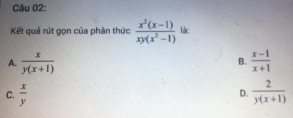 $\dfrac{x^2(x-1)}{xy(x^2-1)}=$ $\dfrac{x^2(x-1)}{xy(x-1)(x+1)}=$ $\dfrac{x^2(x-1):x(x-1)}{xy(x-1)(x+1):x(x-1)}=$ $\dfrac{x}{y(x+1)}$