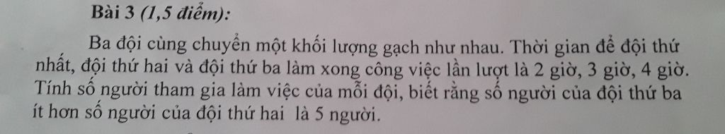 Do đội thứ nhất, đội thứ hai, và đội thứ ba hoàn thành công việc lần lượt trong 2h, 3h, 4h nên ta có